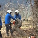 ロープワークを駆使して伐採します。