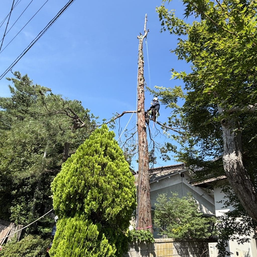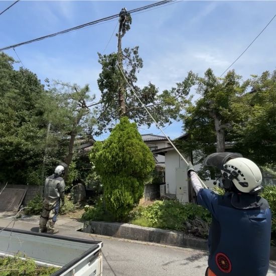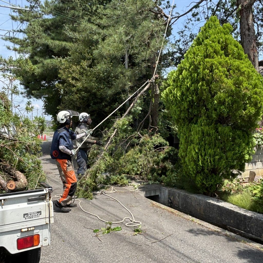枝葉をロープで吊るし、切った枝葉を電線をよけておろしていきます。