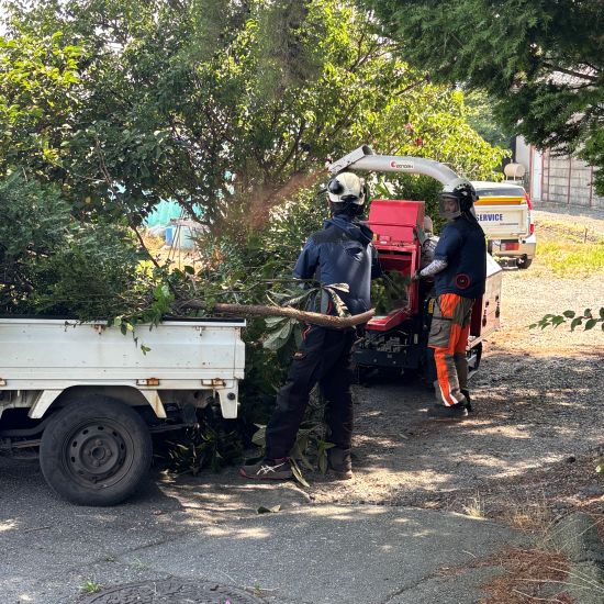 切った枝葉はトラックに積み、所定の場所まで運んで粉砕します。