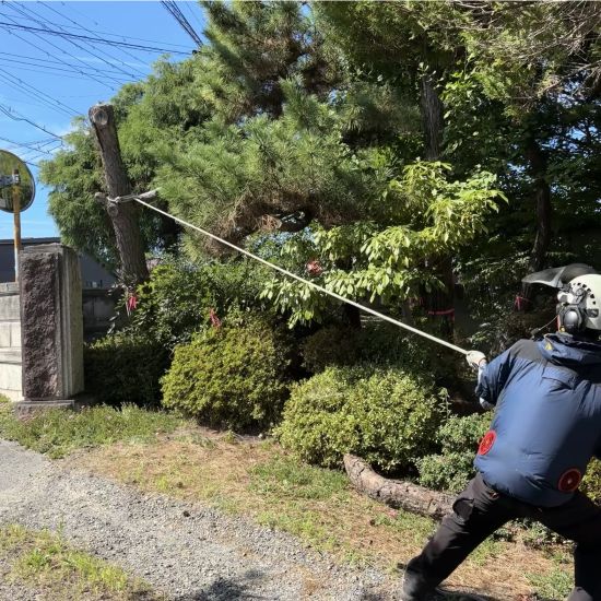 倒せそうな小さな木はロープでテンションを掛けて根本から倒します。