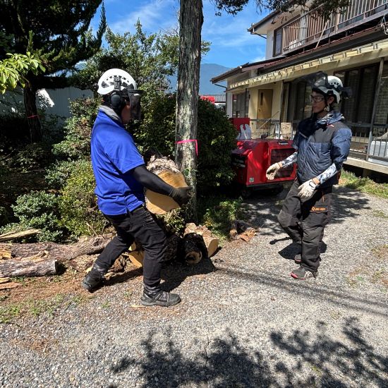背の高い木は登って伐採していきます。