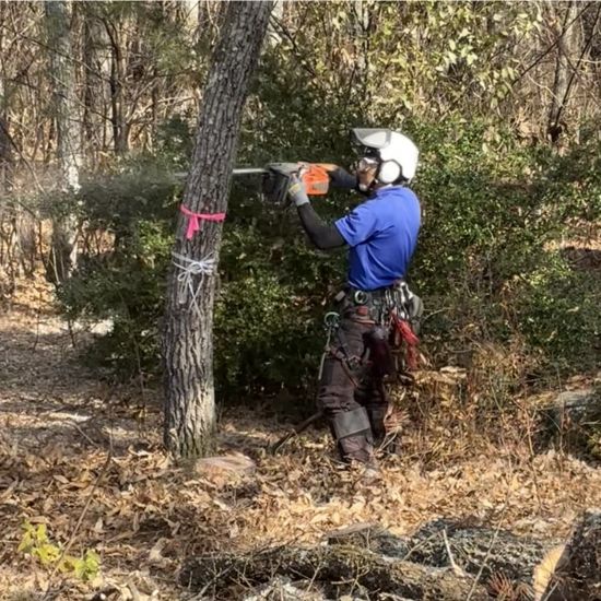 大きく切った幹は立てたまま、少しずつ短く切っていきます。