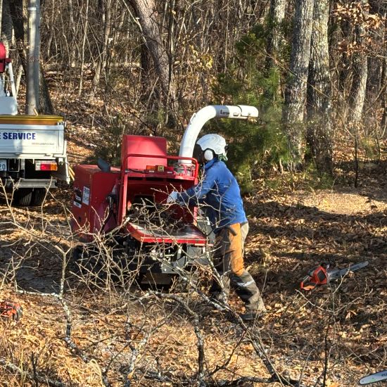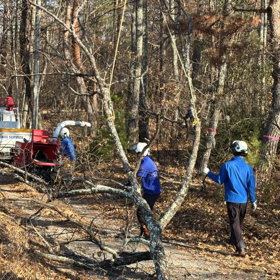 降ろした枝葉は地上でさばき、粉砕機にかけていきます。