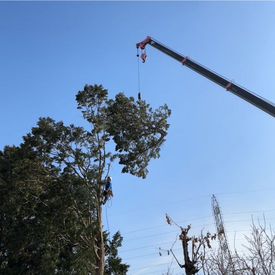 太くて大きい幹はクレーンで所定の場所まで移動させます。