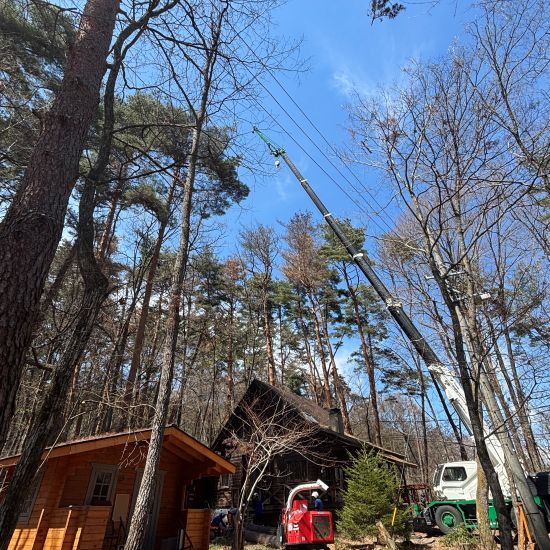 伐採した枝葉をクレーンで降ろします。